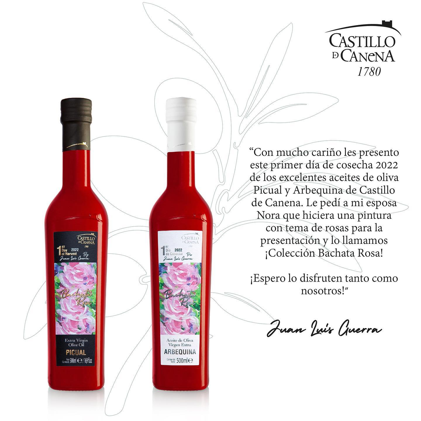 カスティージョ・デ・カネナ ファーストデイ・オブ・ハーベスト2022年収穫のデザインが発表されました。 What's New 2022.11.042022.12.10 空輸による日本への到着は12月末の予定ですが、交通事情により遅れる場合がございます。何卒ご理解いただけますよう、お願い申し上げます。 毎年、初日の収穫日に搾ったオイルだけをボトリングした、カスティージョ・デ・カネナのファースト・デイ・オブ・ハーベスト。ラベルも毎年変わります。今年のラベルは、シンガーソングライターのファン・ルイス・ゲラ(Juan Luis Guerra)氏の妻、ノラの作品。「バチャータ・ロサ・コレクション」と名付けられました。日本へは12月に到着します。まもなく予約を開始いたします。楽しみにお待ちください!